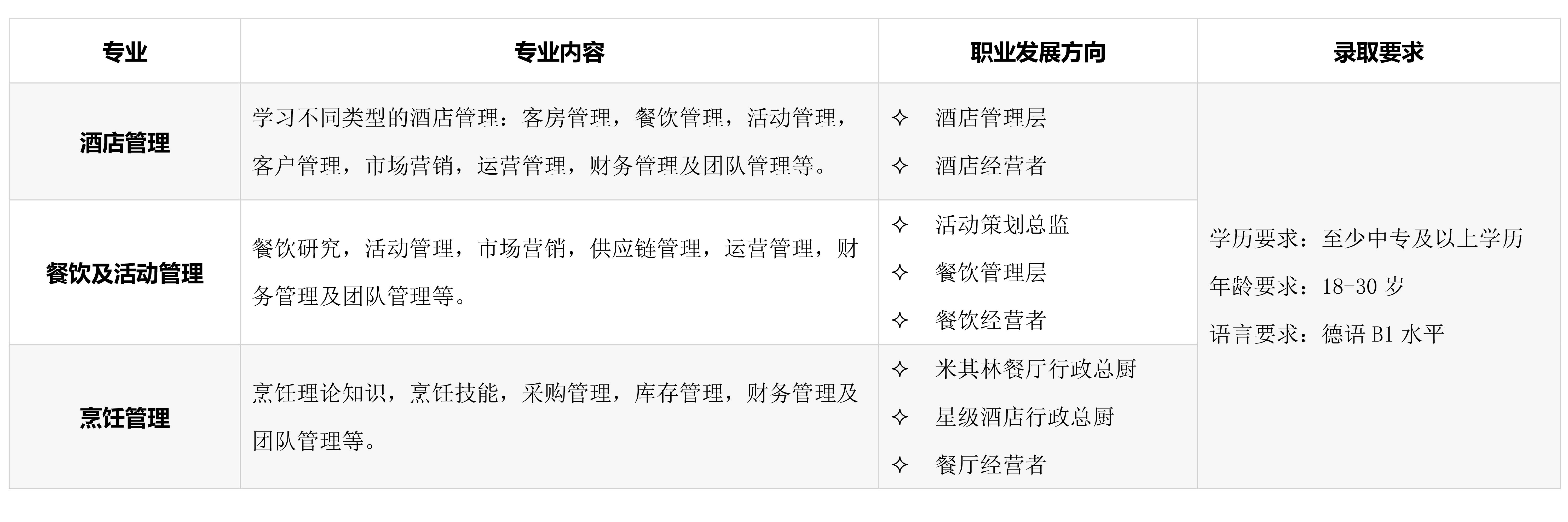 专业人才留学项目,Duale Berufsausbildung 意为双元制培训,学生在学习理论的同时也可以接受实际的技能培训, 双轨并行的一种职业教育模式。该项目的毕业生能力强、经验丰富,德国企业直接录用,这也是为什么50% 的德国学生选择双元制而不是在大学学习。此外:
